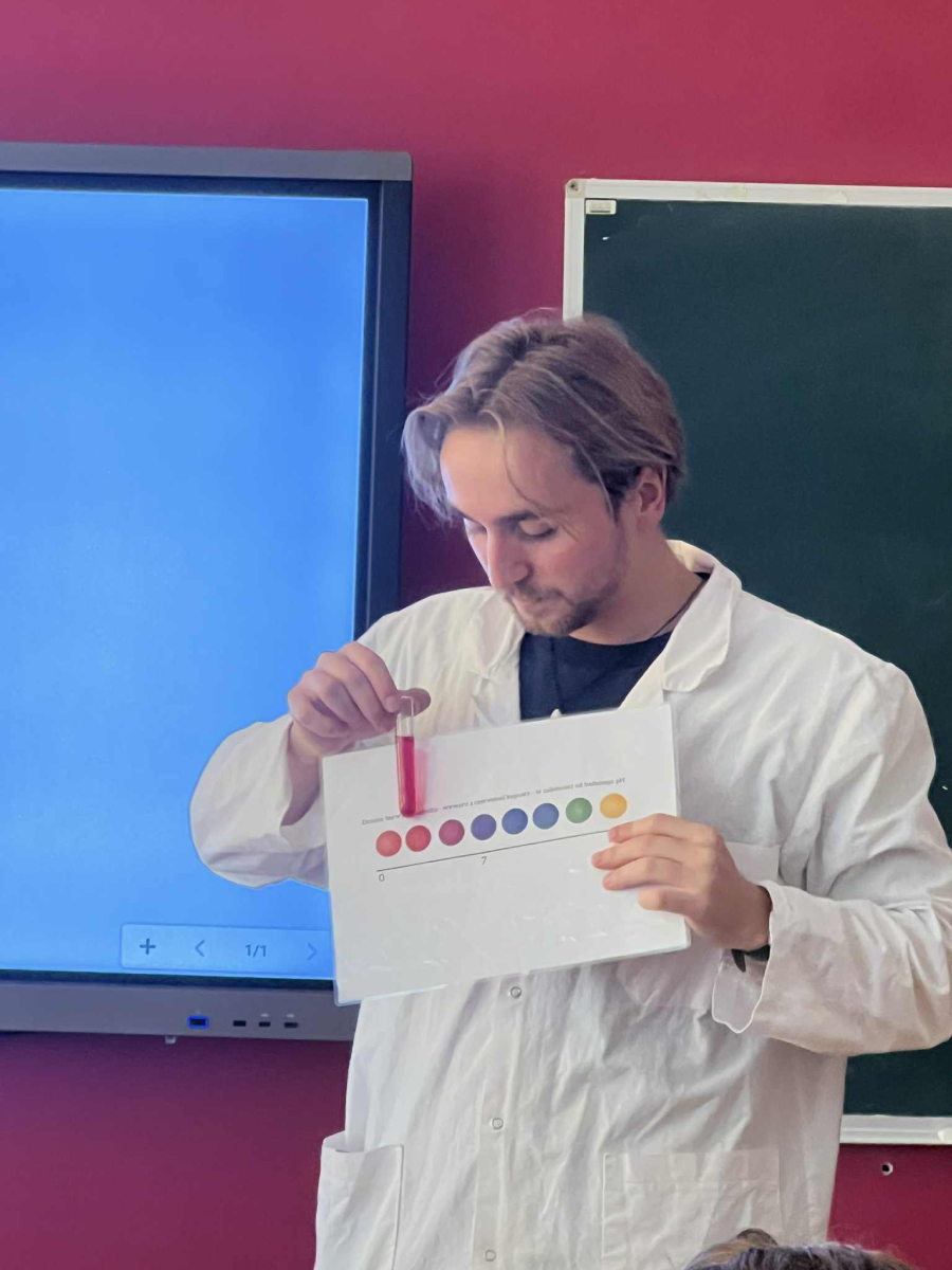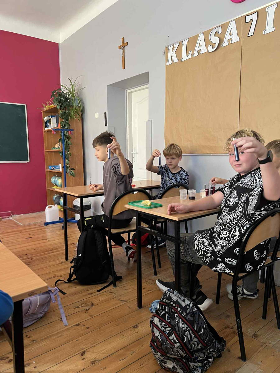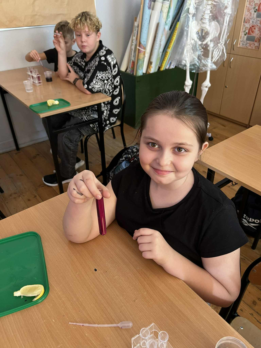 Uczniowie, wyposażeni w statywy, probówki i pipety, samodzielnie przeprowadzali fascynujące eksperymenty z użyciem wywaru z czerwonej kapusty – naturalnego wskaźnika pH. Z zachwytem obserwowali, jak kolory mieszanin zmieniają się w zależności od tego, czy badana substancja ma odczyn kwasowy, zasadowy czy obojętny.