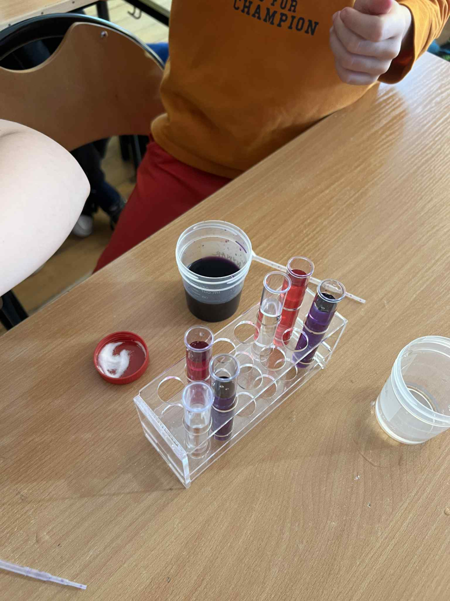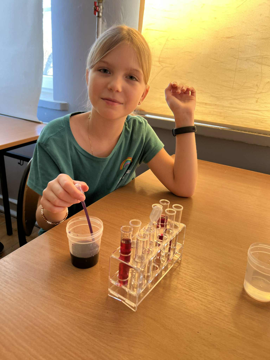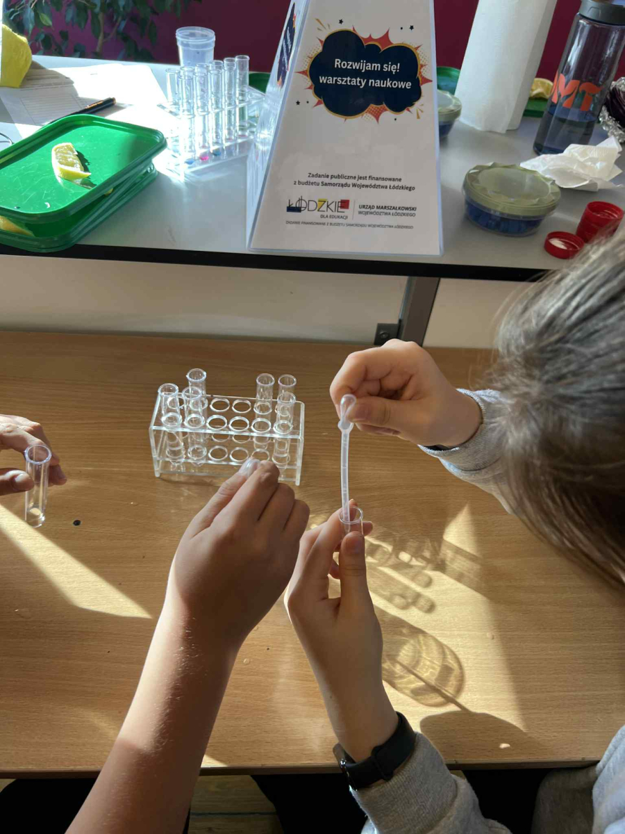 Uczniowie, wyposażeni w statywy, probówki i pipety, samodzielnie przeprowadzali fascynujące eksperymenty z użyciem wywaru z czerwonej kapusty – naturalnego wskaźnika pH. Z zachwytem obserwowali, jak kolory mieszanin zmieniają się w zależności od tego, czy badana substancja ma odczyn kwasowy, zasadowy czy obojętny.